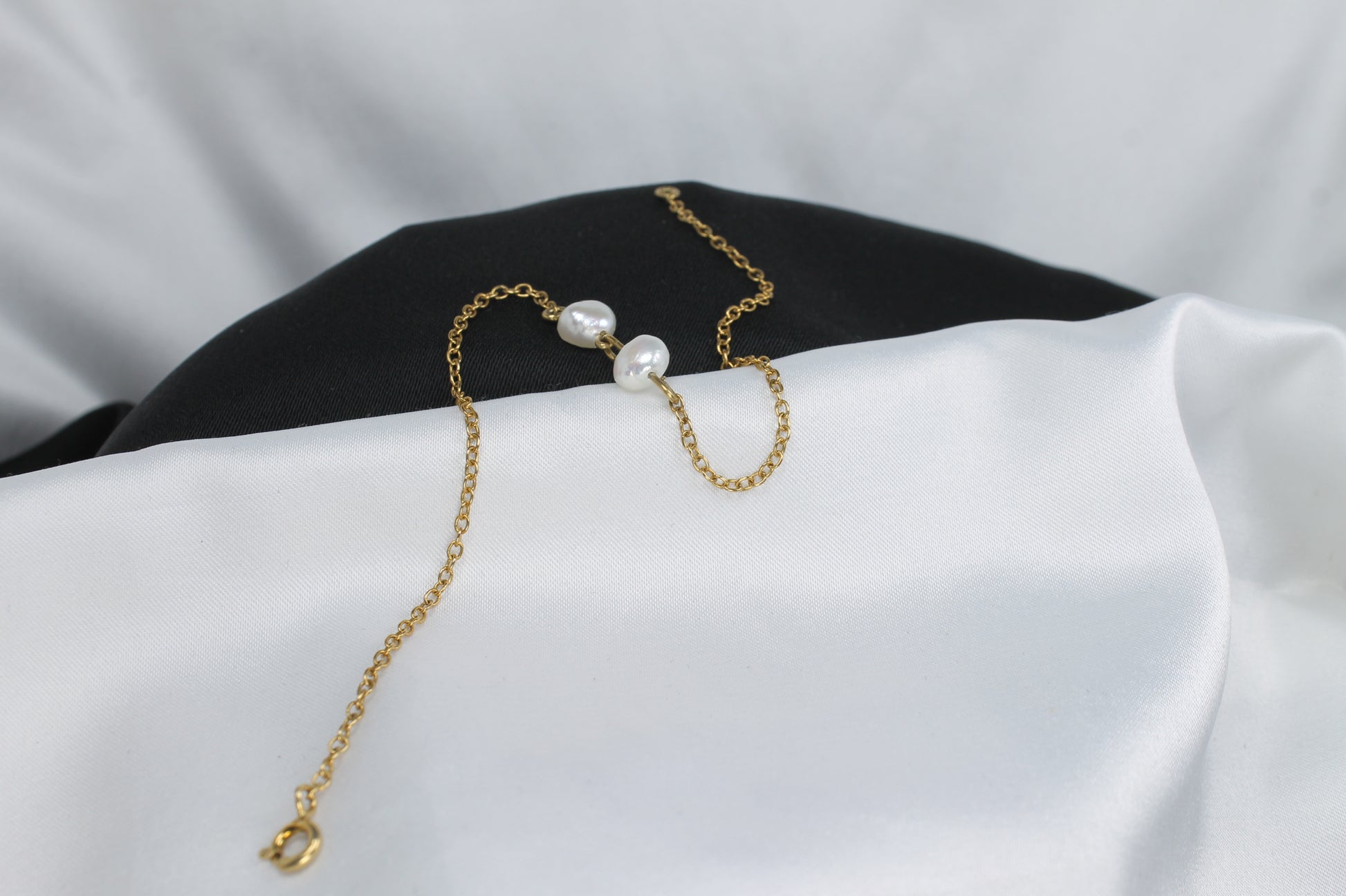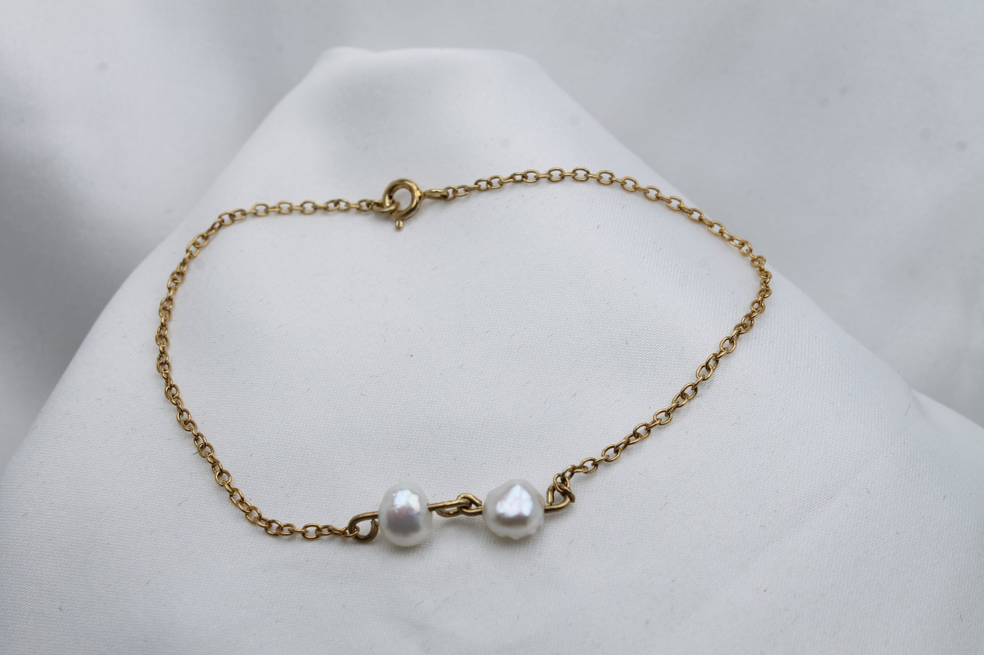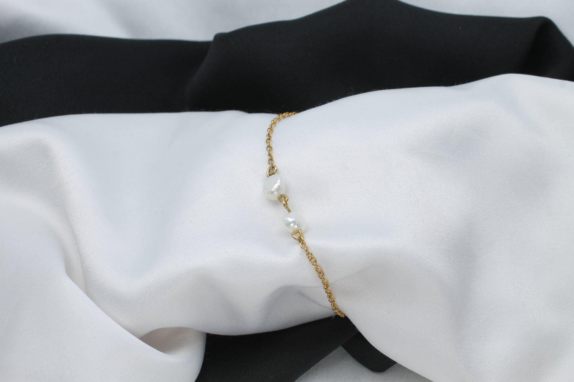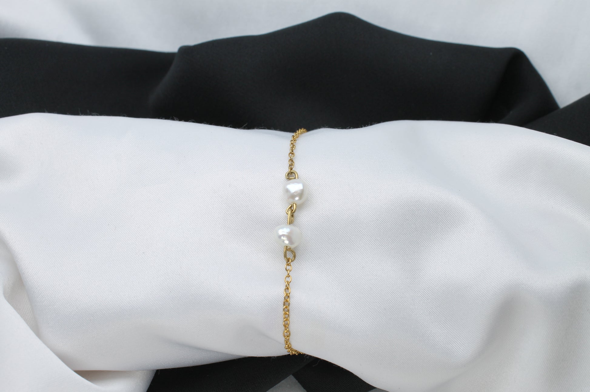 Βραχιόλι χειροποίητο με αλυσίδα από ασήμι, επιχρυσωμένο, 18k, με δυό φυσικά μαργαριτάρια γλυκού νερού (VR0207)
