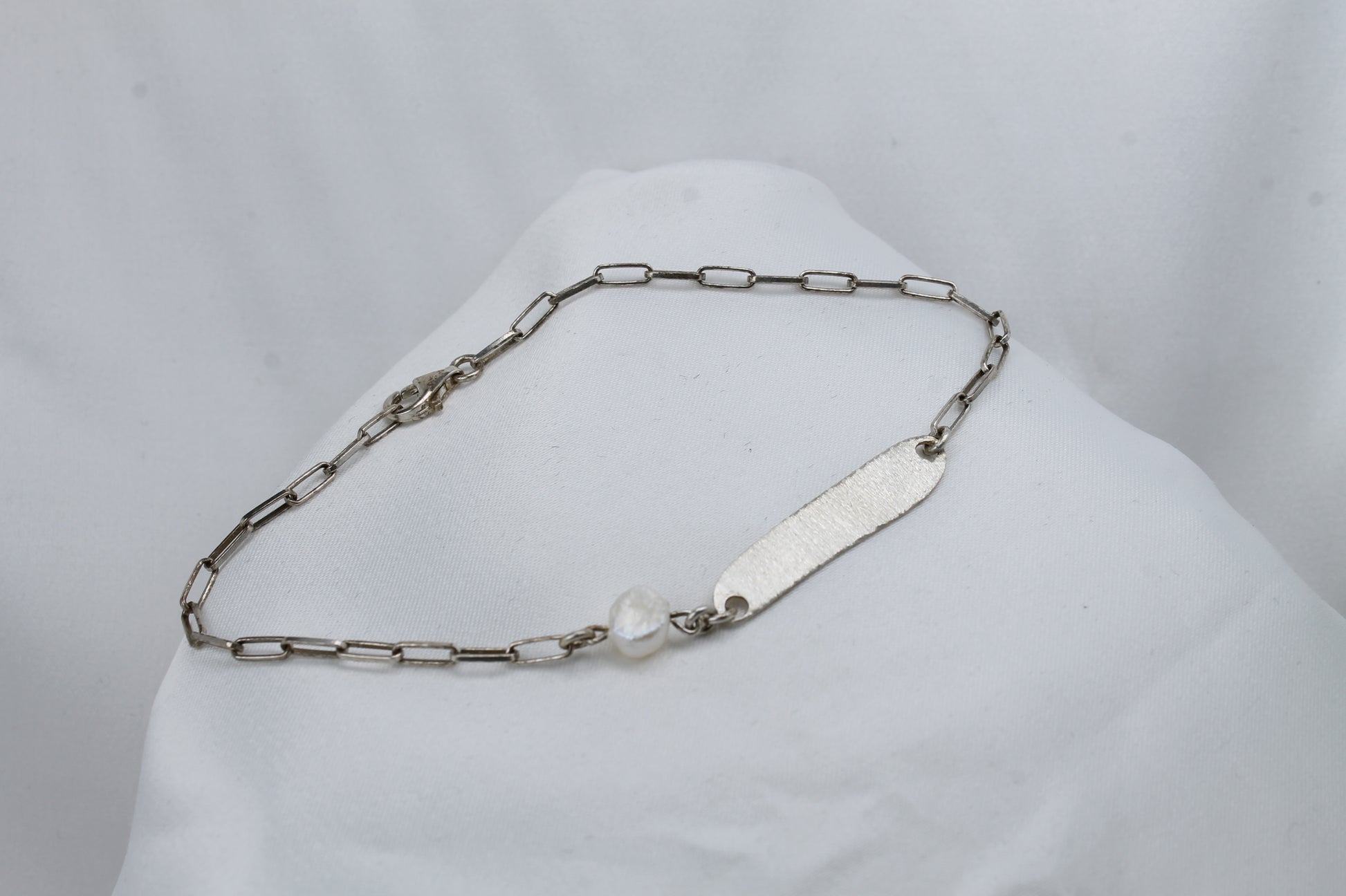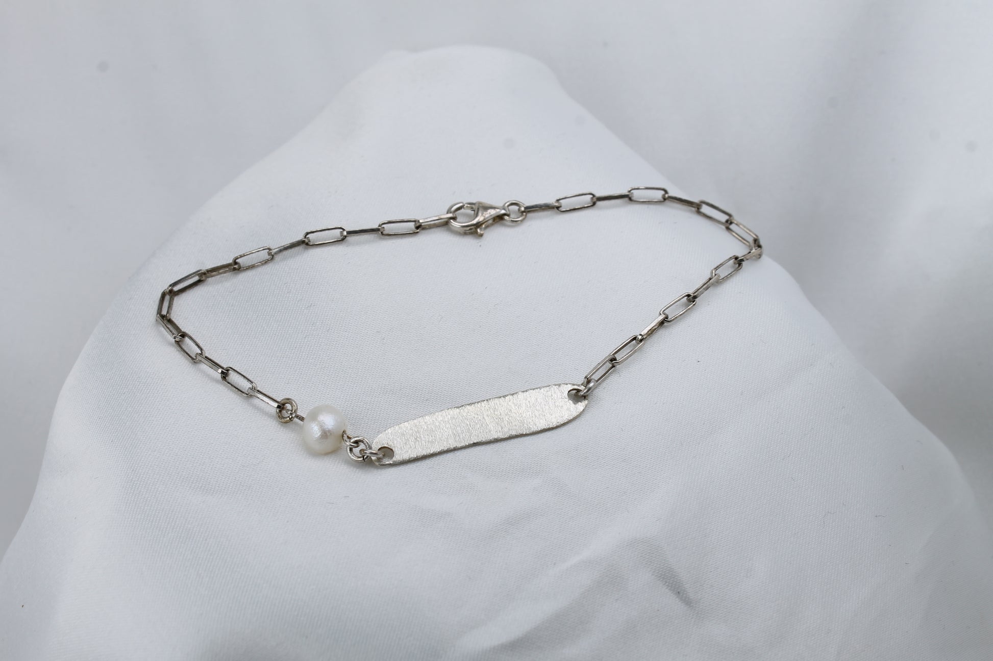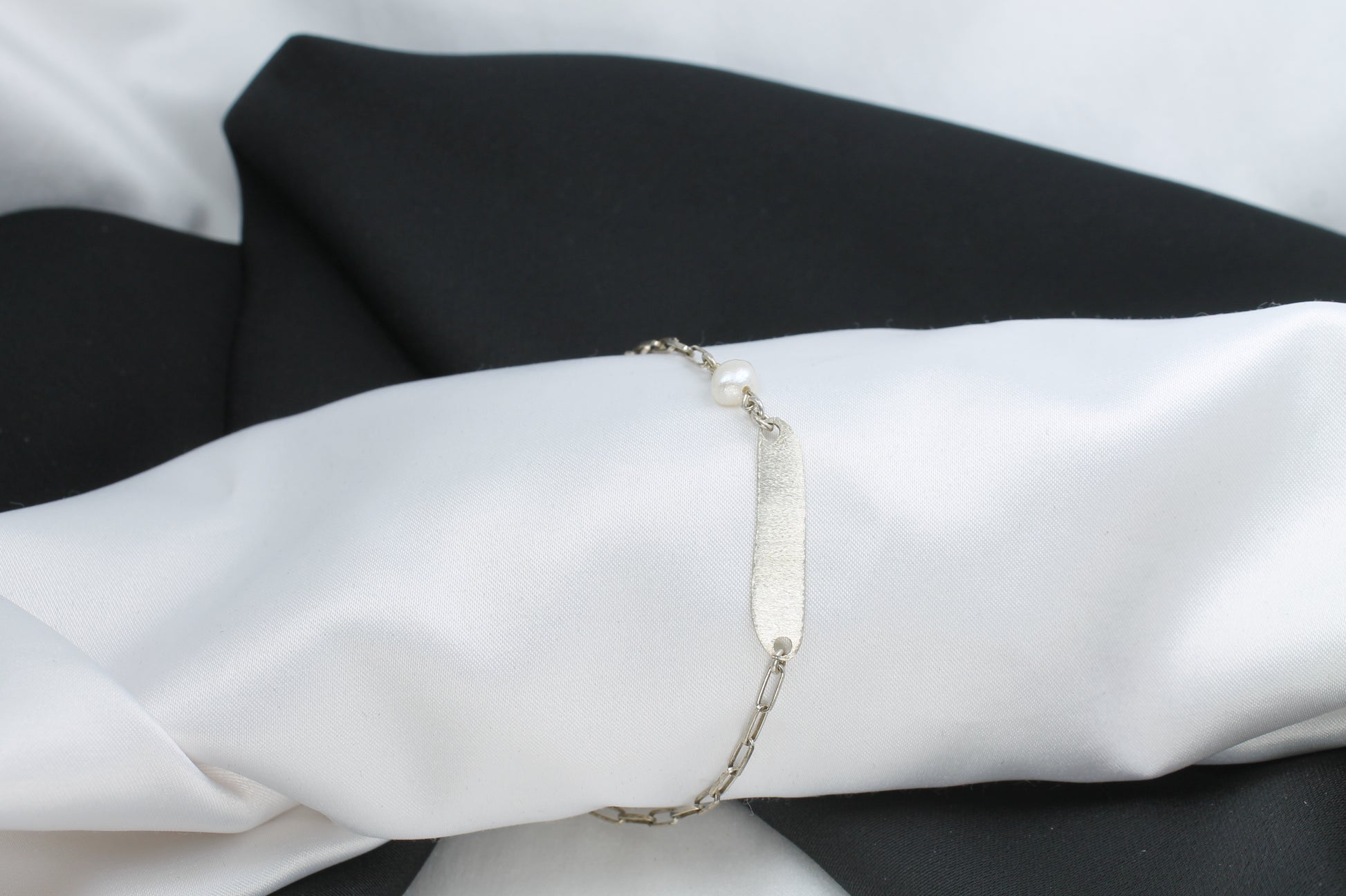 Βραχιόλι χειροποίητο τύπου ταυτότητας από ασήμι, σατινέ με φυσικό μαργαριτάρι γλυκού νερού, Μοντέρνο Σχέδιο (VR0394)