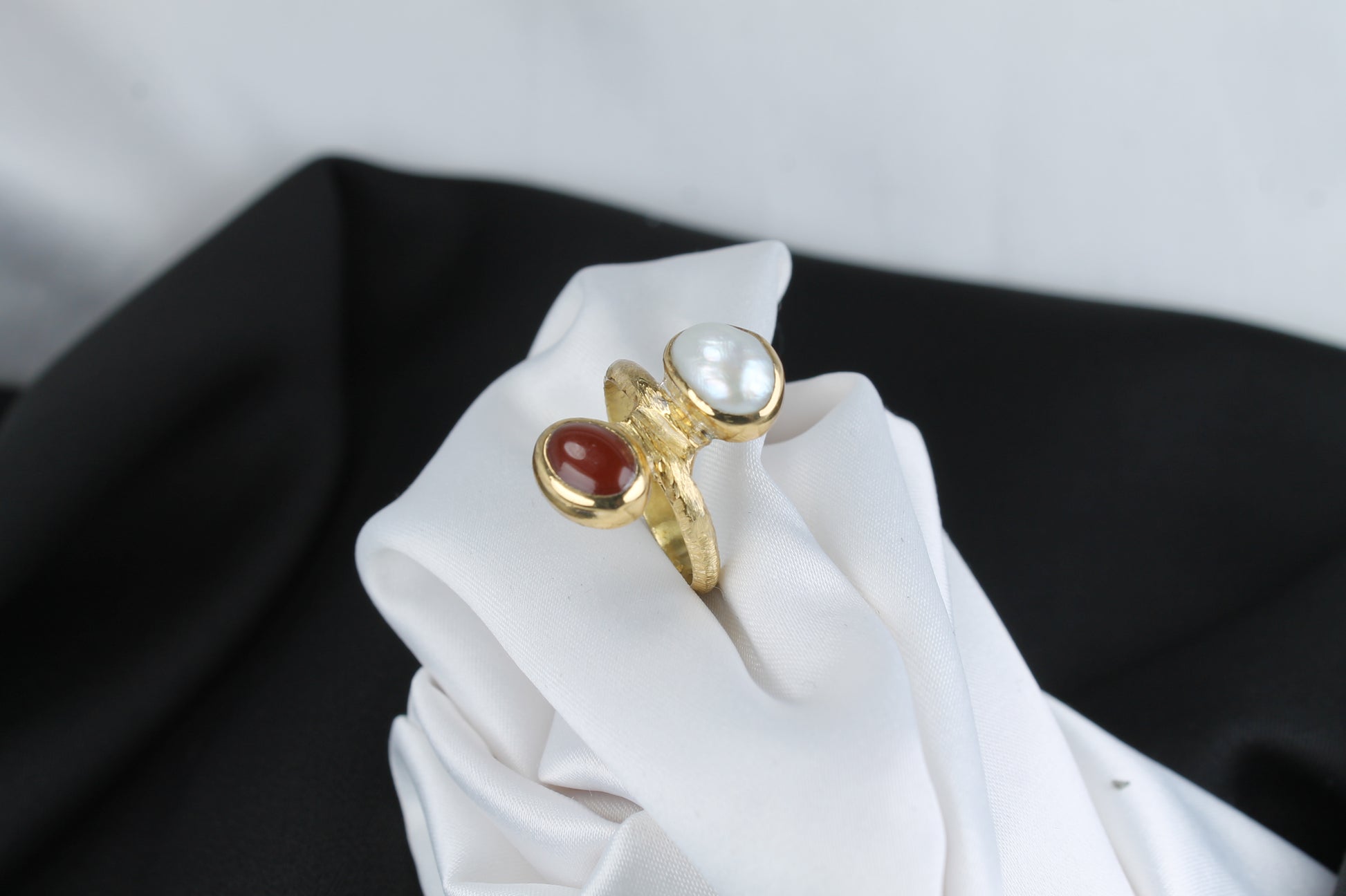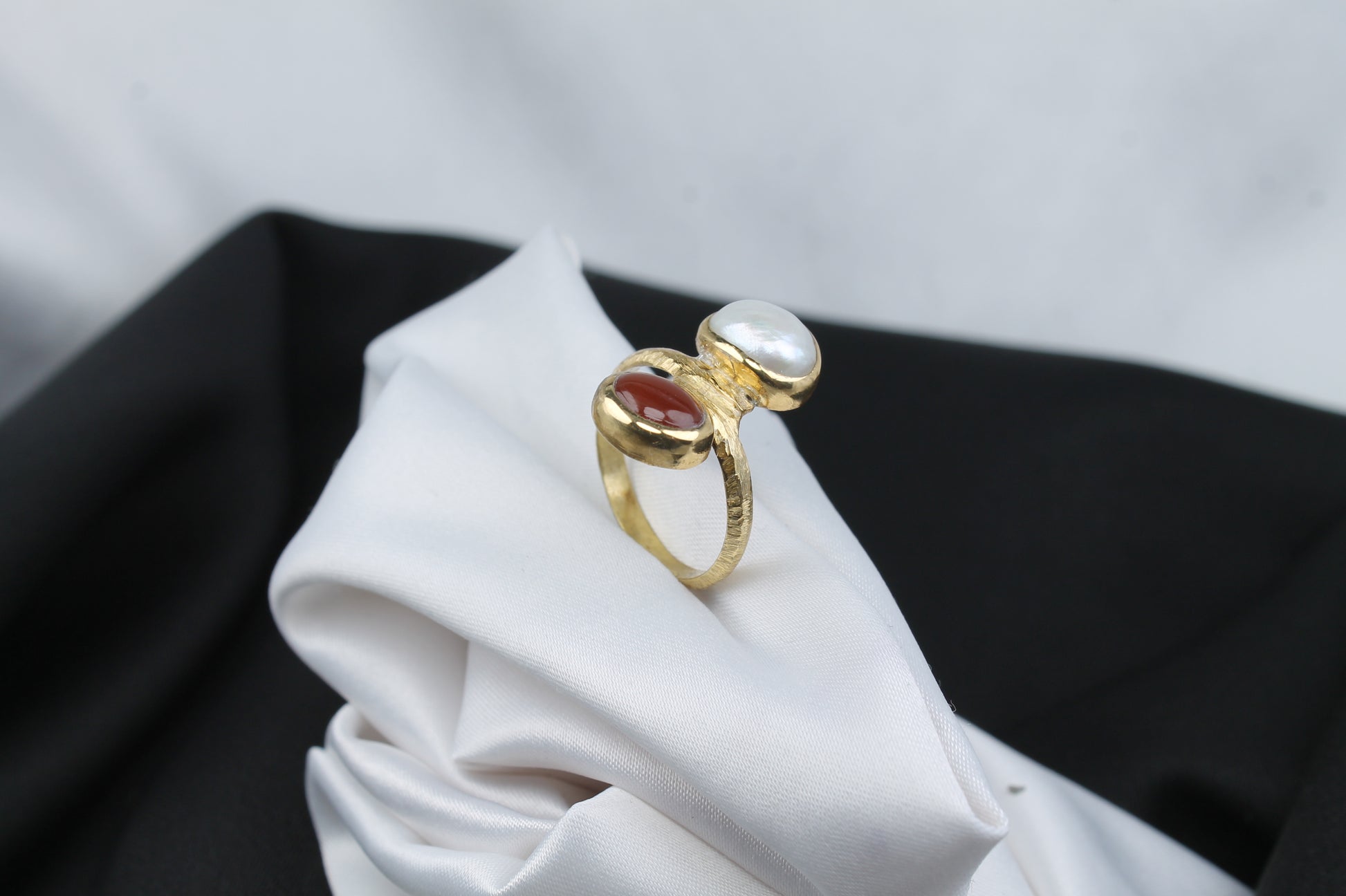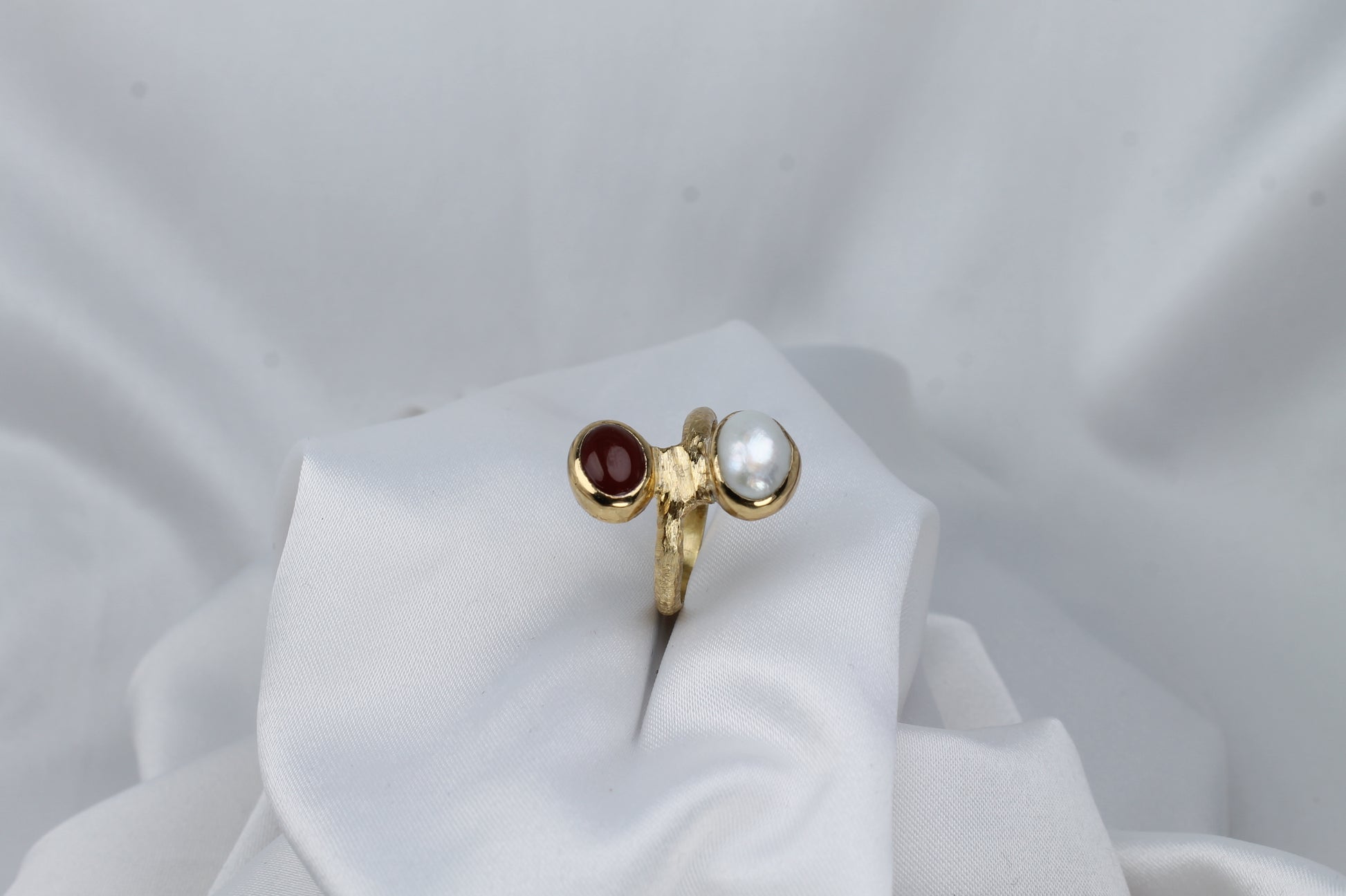 Δαχτυλίδι χειροποίητο από ασήμι, επιχρυσωμένο 18κ σφυρηλατημένο με Ενεργειακή ορυκτή πέτρα καρνεόλη και Φυσικό μαργαριτάρι γλυκού νερού μίνιμαλ σχέδιο (DA0059)
